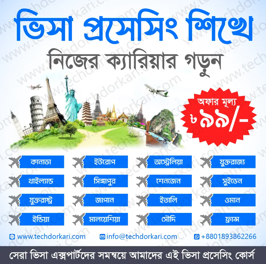 এবার Tech Dorkari নিয়ে এসেছে “ভিসা এক্সপার্ট” ভিডিও কোর্স, যেখানে মাত্র ৯৯ টাকায় (আসল মূল্য ৫০০০ টাকা) শিখতে পারবেন ৩০+ দেশের ভিসা প্রসেসিং সহজ ও স্পষ্টভাবে!